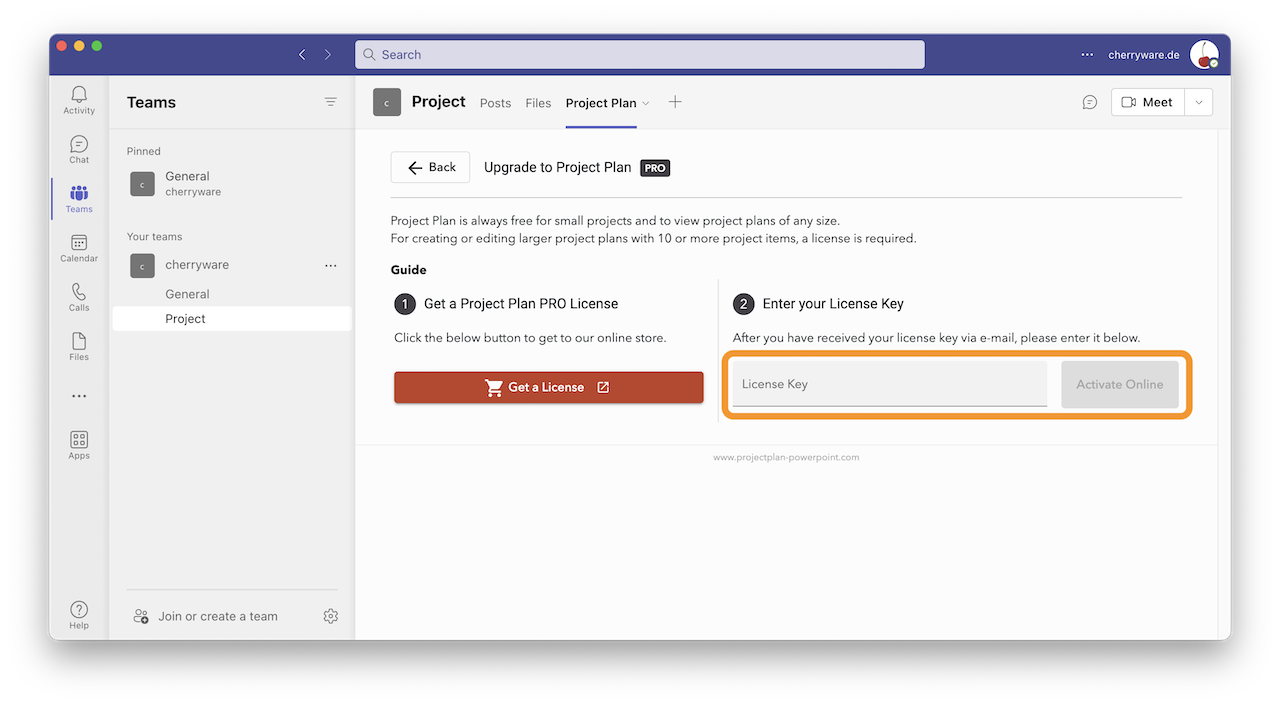 In the Project Plan app, click PRO Upgrade - Copy the license key into the input field.