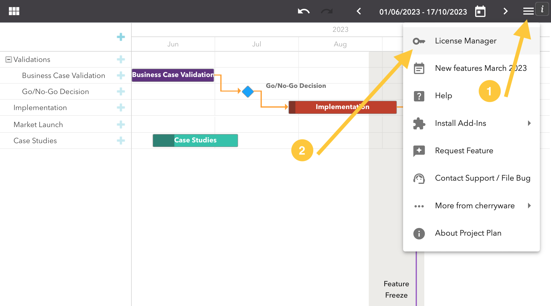 - In the Project Plan app, open the general menu on the top right corner and select License Manager.