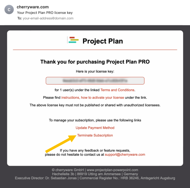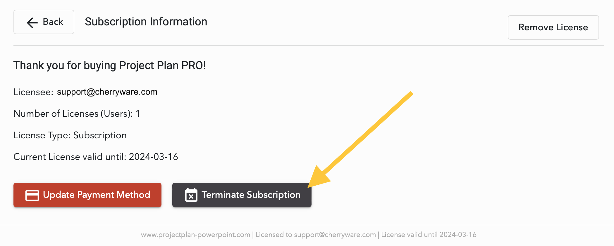 Requirement: The license key needs be activated in the app. - Then click Terminate Subscription and confirm your termination in the browser.